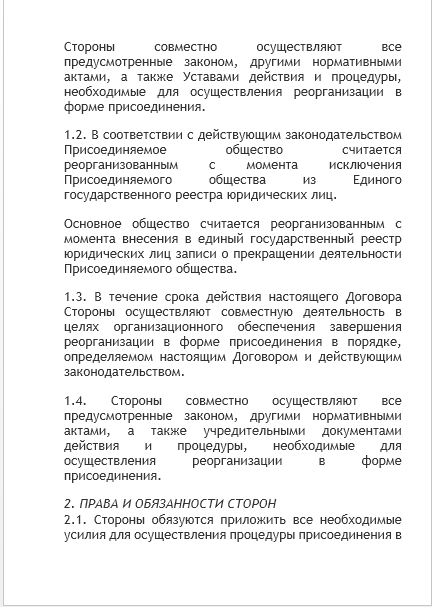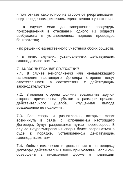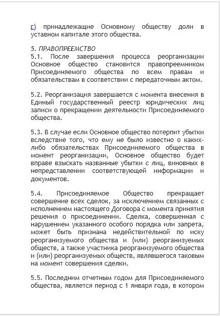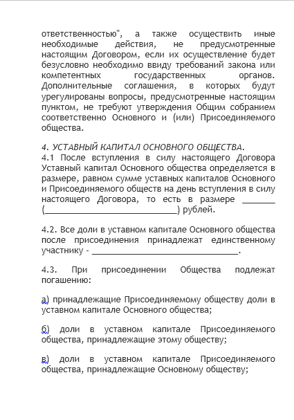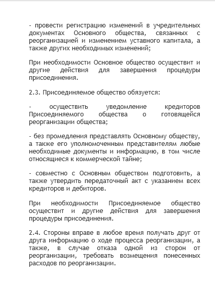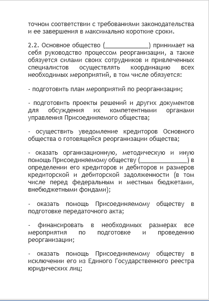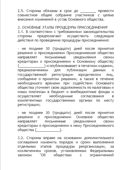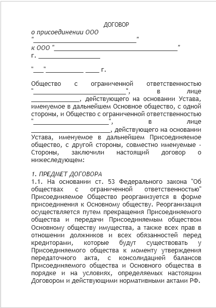 - договор о присоединении — документ, содержание которого практически не урегулировано законодательством. На практике он обязательно содержит порядок погашения долей участников в реорганизуемых компаниях, порядок распределения долей в компании, остающейся действовать после реорганизации. По согласованию участников процедуры в рассматриваемое соглашение могут включаться любые условия: о сроках проведения отдельных этапов, о составе будущих исполнительных органов, о структурных изменениях поглощающей компании после реорганизации и прочее;